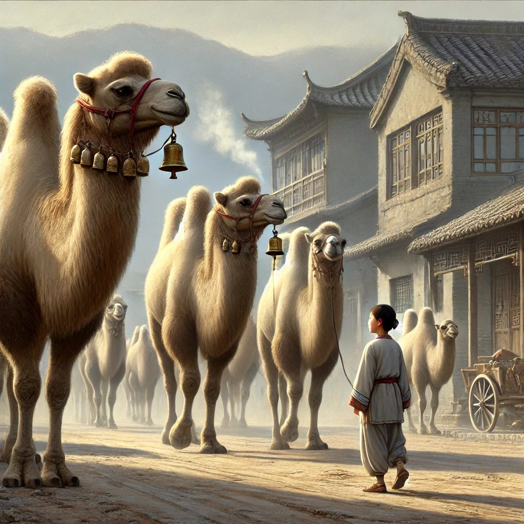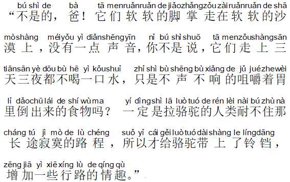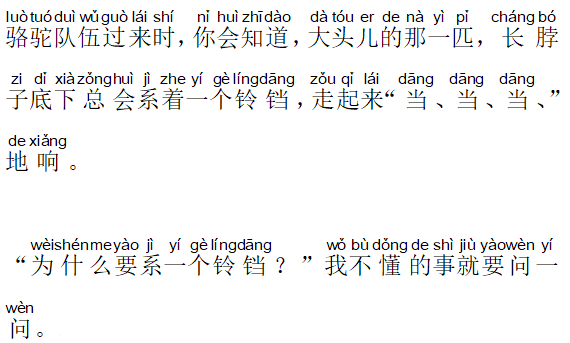 “不是的, 爸! 它们软软的脚掌走在软软的沙漠上,没有一点声音,你不是说,它们走上三天三夜都不喝一口水,只是不声不响的咀嚼着胃里倒出来的食物吗? 一定是拉骆驼的人类耐不住那长途寂寞的路程,所以才给骆驼带上了铃铛,增加一些行路的情趣。”