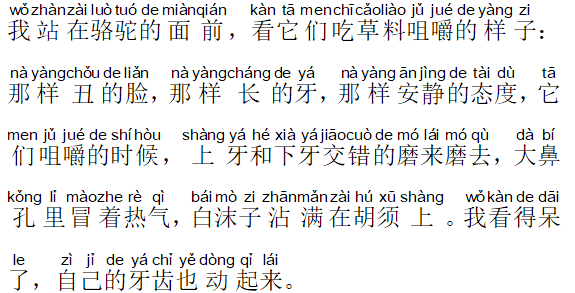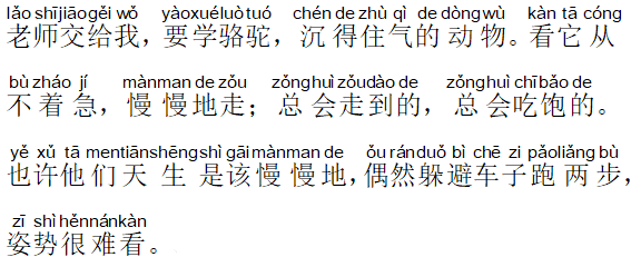 老师交给我,要学骆驼,沉得住气的动物。看它从不着急,慢慢地走;总会走到的,总会吃饱的。也许他们天生是该慢慢的,偶然躲避车子跑两步,姿势很难看。