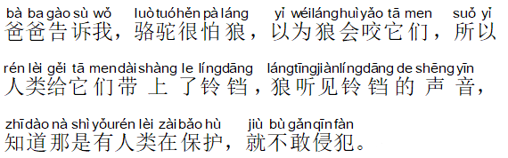 爸爸告诉我,骆驼很怕狼,以为狼会咬它们,所以人类给它们带上了铃铛,狼听见铃铛的声音,知道那是有人类在保护,就不敢侵犯。