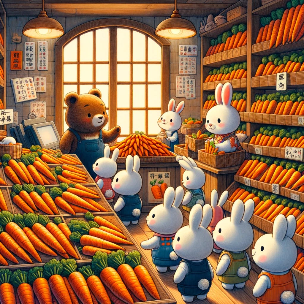 于是,它到处采购萝卜。(And then 于是, it 它 went all around 到处 buying 采购 carrots 萝卜.)