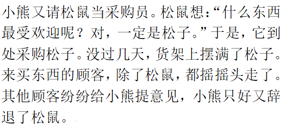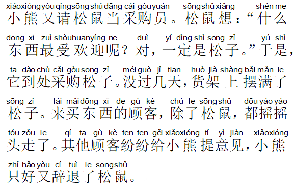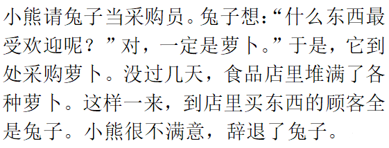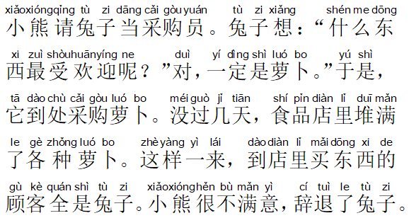 小熊请兔子当采购员。(The little bear 小熊 invited 请 the rabbit 兔子 to be 当 the purchaser 采购员.)