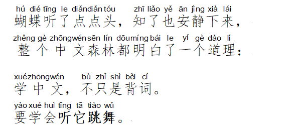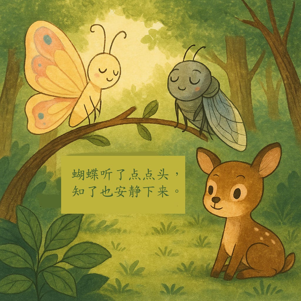 蝴蝶 (butterfly) 听了点点头 (listened and nodded), 知了 (cicada) 也安静下来 (also quieted down), 整个中文森林 (the whole Chinese forest) 都明白了 (all understood) 一个道理 (a principle):