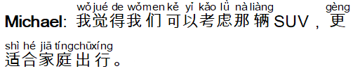 Michael: 我觉得我们可以考虑那辆SUV,更适合家庭出行。