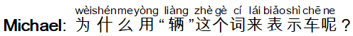 Michael: 为什么用“辆”这个词来表示车呢?