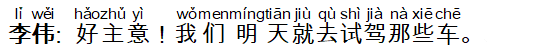 李伟: 好主意!我们明天就去试驾那些车。