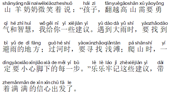 山羊奶奶微笑着说:“孩子,翻越高山需要勇气和智慧,我给你一些建议。遇到大雨时,要找到避雨的地方;过河时,要寻找浅滩;爬山时,一定要小心脚下的每一步。”乐乐牢记这些建议,带着满满的信心出发了。