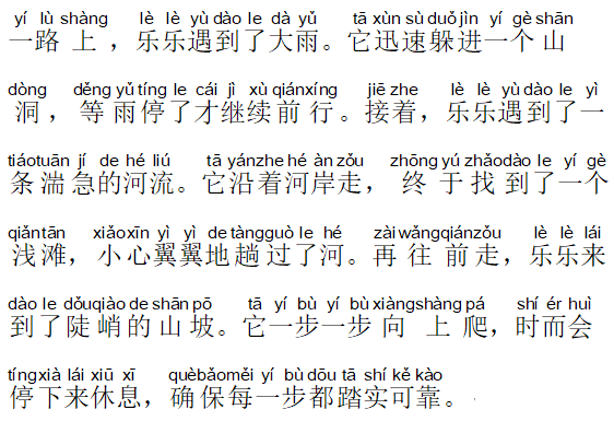 一路上 (the whole way), 乐乐遇到了 (LeLe encountered) 大雨 (heavy rains)。它迅速 (It hurridly) 躲进一个山洞 (ducked into a cave), 等雨停了 (waited until the rain stopped) 才 (only then) 继续 (continued) 前行 (to proceed on the way)。接着 (following that), 乐乐遇到了 (LeLe encountered) 一条湍急的河流 (a rushing river)。它沿着河岸走 (it walked along the river bank),终于 (finally) 找到了 (found) 一个浅滩 (a sandbar),小心翼翼地 (prudently) 趟过了河 (waded across the river)。再往前走 (continuing to walk on),乐乐来到了 (LeLe arrived at) 陡峭的山坡 (a precipitous slope)。它一步一步 (one step at a time, it) 向上爬 (crawled upward),时而会 (sometimes would) 停下来 (stop) 休息 (to rest),确保 (ensuring) 每一步都 (each step) 踏实可靠 (reliable)。