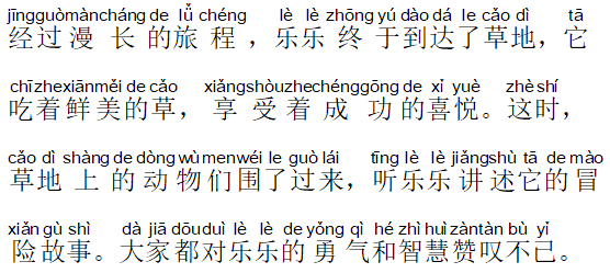 经过漫长的旅程,乐乐终于到达了草地,它吃着鲜美的草,享受着成功的喜悦。这时,草地上的动物们围了过来,听乐乐讲述它的冒险故事。大家都对乐乐的勇气和智慧赞叹不已。