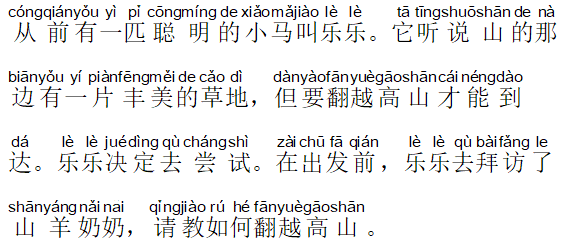 从前 (once upon a time) 有 (there was) 一匹聪明的小马 (a small smart horse) 叫乐乐 (called LeLe)。它听说 (it had heard that) 山的那一边 (on the other side of the mountain) 有 (there is) 一片丰美的草地 (a strip of flourishing grassland), 但 (but) 要 (must) 翻越 (cross over) 高山 (high mountains) 才 (only then) 能 (can) 到达 (arrive)。乐乐决定 (LeLe decided) 去 (to go) 尝试 (try)。在出发前 (before taking off), 乐乐去拜访了 (LeLe went to visit) 山羊奶奶 (grandma mountain goat), 请教 (to ask for advice on) 如何 (how to) 翻越高山 (cross over the high mountains)。