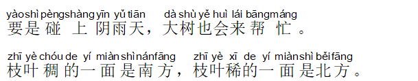 枝叶(branches and leaves)稠的一面(the dense side)是南方(is the southern direction),枝叶(branches and leaves)稀的一面(the sparse side)是北方(is the northern direction)。