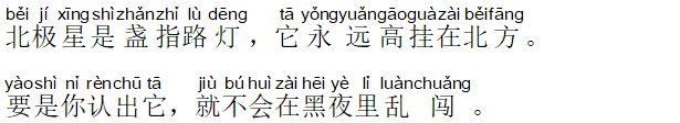 星 (xīng) – star, 星星 (北极星在夜空中始终固定不变,是导航的重要参考点。)
