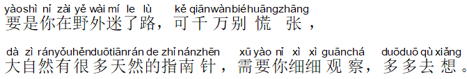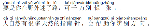 南北 (nán běi) – South - North (The reading discusses how to determine north and south using natural guides like the sun, tree shadows, and snow.)