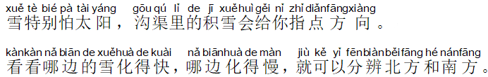 "看看 (take a look at) 哪边 (which side) 的 雪 (snow) 化得快 (melts faster),哪边 (which side) 化得慢 (melts slower),就 (then) 可以 (can) 分辨 (distinguish) 北方 (north) 和 (and) 南方 (south)."