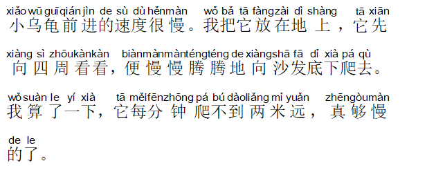 小乌龟前进的速度很慢。我把它放在地上,它先向四周看看,便慢慢腾腾地向沙发底下爬去。我算了一下,它每分钟爬不到两米远,真够慢的了。