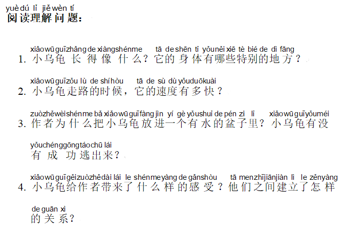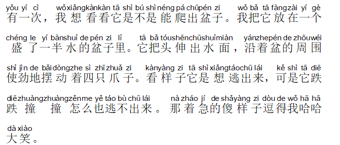 有一次,我想看看它是不是能爬出盆子。我把它放在一个盛了一半水的盆子里。它把头伸出水面,沿着盆的周围使劲地摆动着四只爪子。看样子它是想逃出来,可是它跌跌撞撞怎么也逃不出来。那着急的傻样子逗得我哈哈大笑。