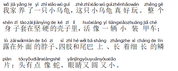 我家养了一只小乌龟,这只小乌龟真好玩。整个身子套在坚硬的壳子里,活像一辆小装甲车;露在外面的脖子、四肢和尾巴上、长着细长的鳞片:头有点像蛇、眼睛又圆又小。